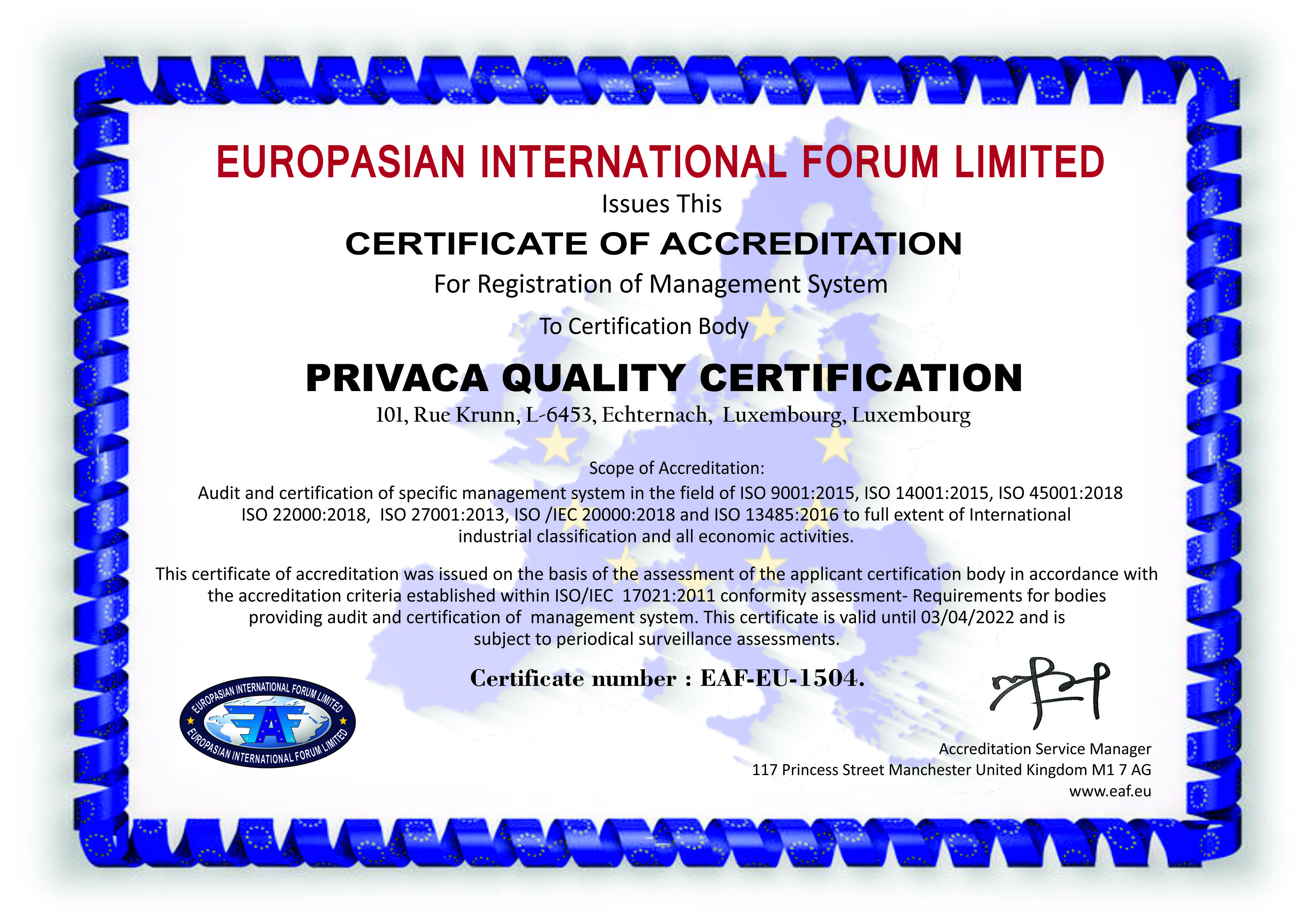 Accreditation FormPrivaca Quality Certification Limited is an accredited Management System Certification Body by Europasian International Form Limited (EAF) under ISO/IEC 17021:2015 – Requirements for bodies providing audit and certification of management systems.